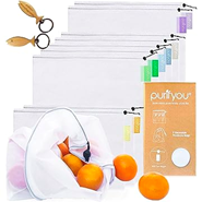 This basket Includes a collection of earth firnedly kitchen items. The list includes: 100% cotton flour sack dish towels, Machine washable Bamboo towels, Set of 4 silicone Food Huggers, Hem & Harvest reusable grocery bags set of 5, Purifyou heavy duty reusable produce bag set of 9, Bee’s Wrap Variety pack